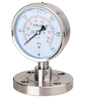 隔膜壓力表概述: ?隔膜壓力表是由一個不同類型的通用壓力表與一個具有特定要求的由連接體和隔膜隔離體組成的隔離器配接而成的。通過這種配接,使一般通用型的波登管壓力表,增加了測量腐蝕性強、溫度高、粘度大或含有固態浮游物、易凝固介質壓力的性能,隔膜壓力表廣泛應用于石工、化工、氯堿、化纖、制藥、鋼鐵、食品等行業生產過程中,測量各種流體介質的壓力。 1/結構原理隔離膜片在被測介質壓力P的作用下產生變形,壓縮內部充填的工作液形成一個相當于P的壓力P’,經工作液的傳導,使壓力儀表中的彈性元件自由端產生相應的變形,并按與之相配接的類別壓力儀表工作原理顯示出被測的壓力值。 隔膜材料:0Cr7Ni12Mo2Ti(316L);蒙乃爾合金(Cu30Ni70);哈氏合金(H276C);鉭(Ta)及氟塑料(F4)。 法蘭材料:不銹鋼0Cr17Ni12Mo2(316);不銹鋼襯氟塑料(316+F4)。 密封墊圈材料:丁腈橡膠;氟橡膠;硅橡膠及氟塑料。 2/法蘭的選擇:國內實際使用情況及常用法蘭系列標準。供用戶選用,也可接受其它規格特殊訂貨。 3/ 型號及規格